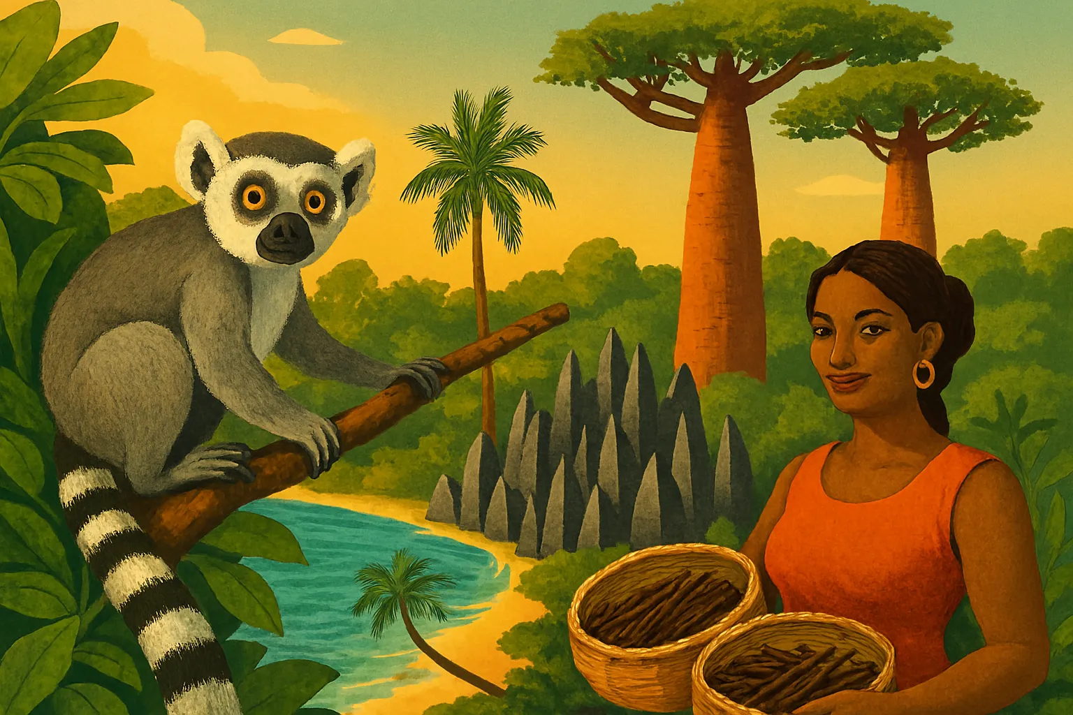 Madagascar hosts six endemic baobab species and more than 100 lemur species and subspecies. Île Sainte-Marie was a famed pirate refuge in the 17th-18th centuries, with a purported pirate cemetery. The Avenue of the Baobabs near Morondava is one of Africa’s most photogenic sites. The island experiences frequent cyclones; Cyclone Gafilo in 2004 was among the strongest recorded in the southwest Indian Ocean. The animated film franchise Madagascar brought global attention to the island’s name, though the films were not made there. Vanilla from Madagascar flavors ice creams and desserts worldwide.