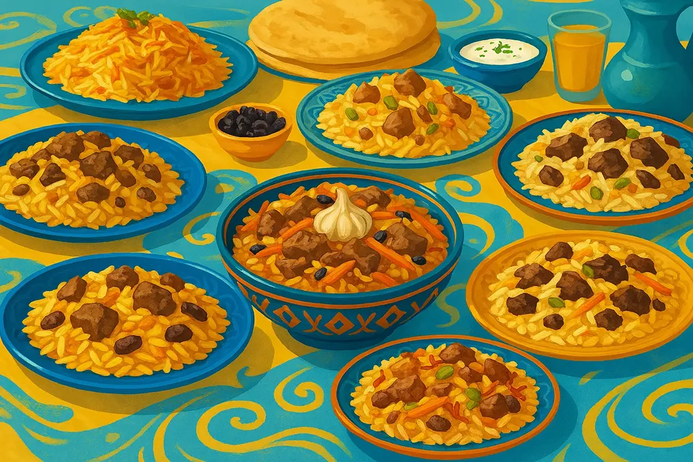 Таджикистан – более насыщенный и жирный на вкус, часто с нутом и изюмом, подается на больших общих блюдах.