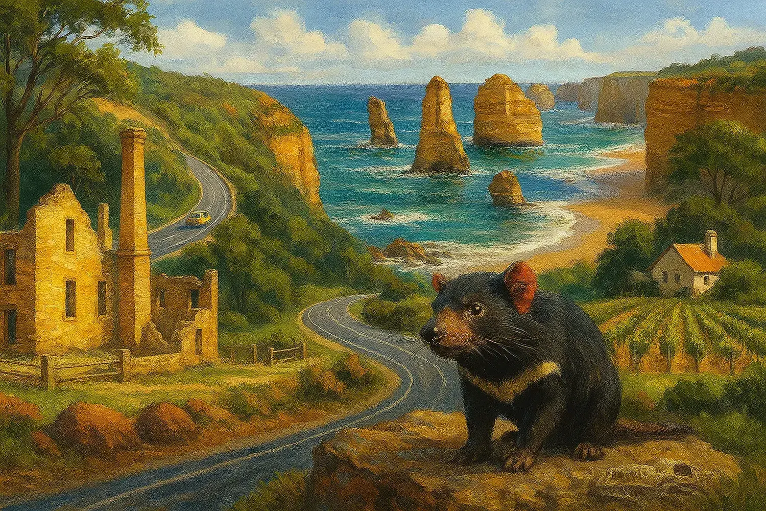 Великая океанская дорога, Королевская выставка и сады Карлтон в Мельбурне, древнейшие в мире аквакультурные практики народа гундижмара, каторжные поселения Порт-Артура, Двенадцать апостолов, Австралийский открытый чемпионат и Формула‑1 в Мельбурне, кофе.