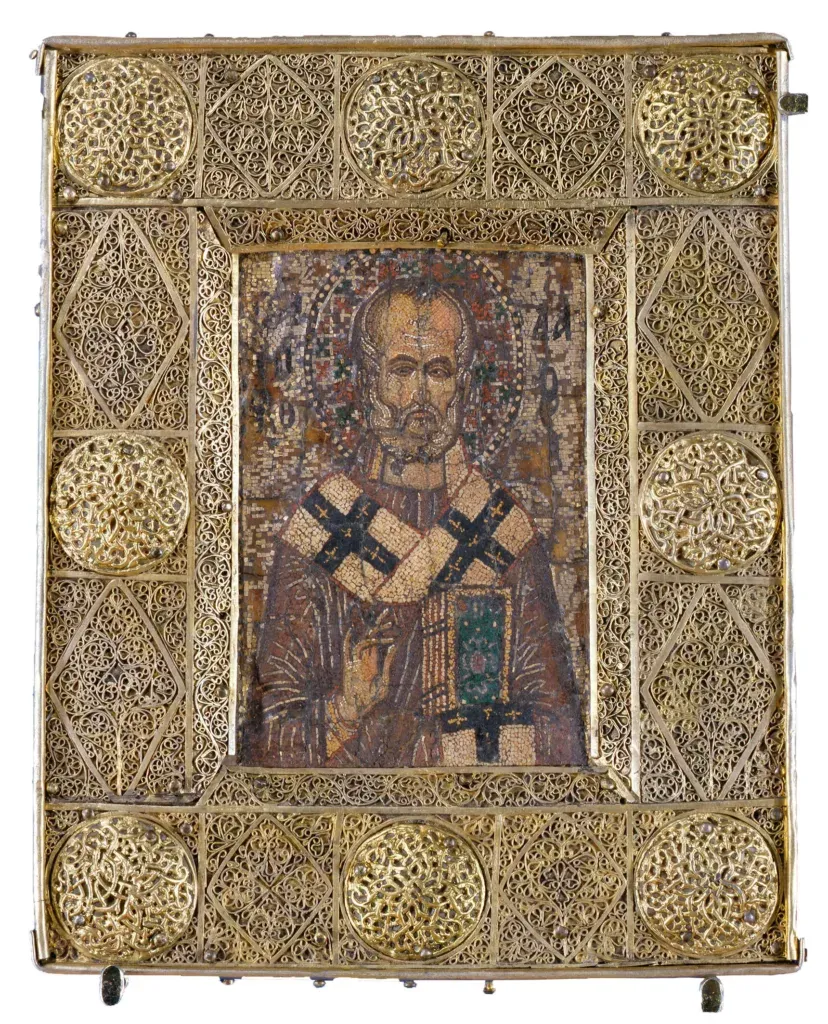 The Louvre exhibition includes a fifth work: an exquisitely crafted micro-mosaic representing Saint Nicholas, with a gold frame, believed to hail from late 13th or early 14th century Constantinople. It is one of about 50 such works in the world, noted Apenko-Kurovets, stressing that “all five exhibits at the Louvre are extremely rare – and extremely fragile”.