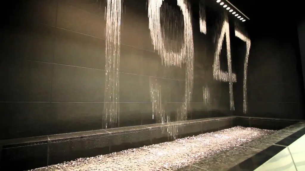 Уникальные цифровые часы-фонтан, где струи воды формируют цифры и узоры; современный символ инженерного искусства.