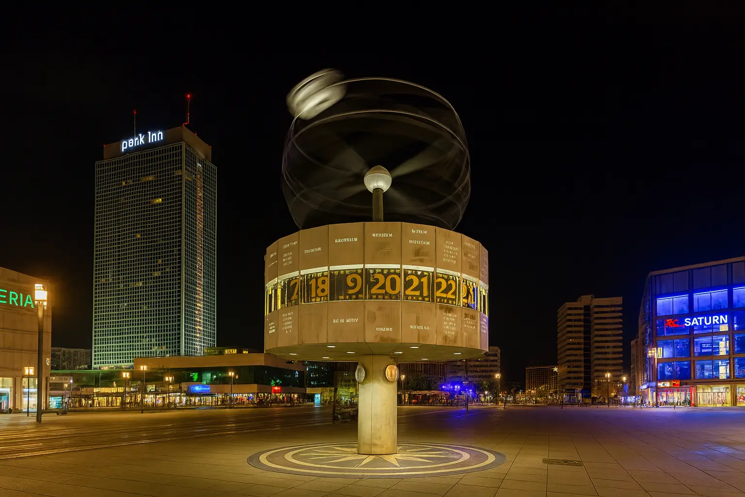 Культовый символ Александерплац, показывают время всех часовых поясов мира; популярное место встреч и фотосессий.