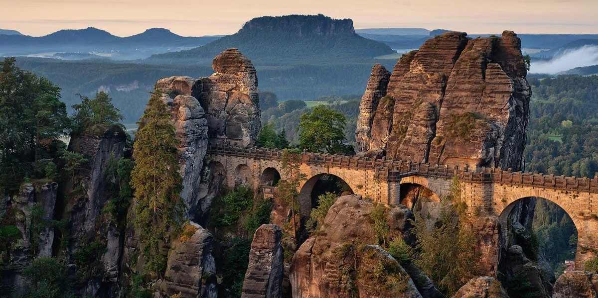 Скальное образование в Саксонской Швейцарии, возвышающееся над рекой Эльбой примерно на 200 метров. Главная достопримечательность — каменный Бастайский мост длиной около 76 метров, соединяющий несколько утёсов. Скалы сформировались миллионы лет назад в результате водной эрозии и стали символом региона. Здесь открываются панорамные виды на Эльбские песчаниковые горы, крепость Кёнигштайн и долину Эльбы.