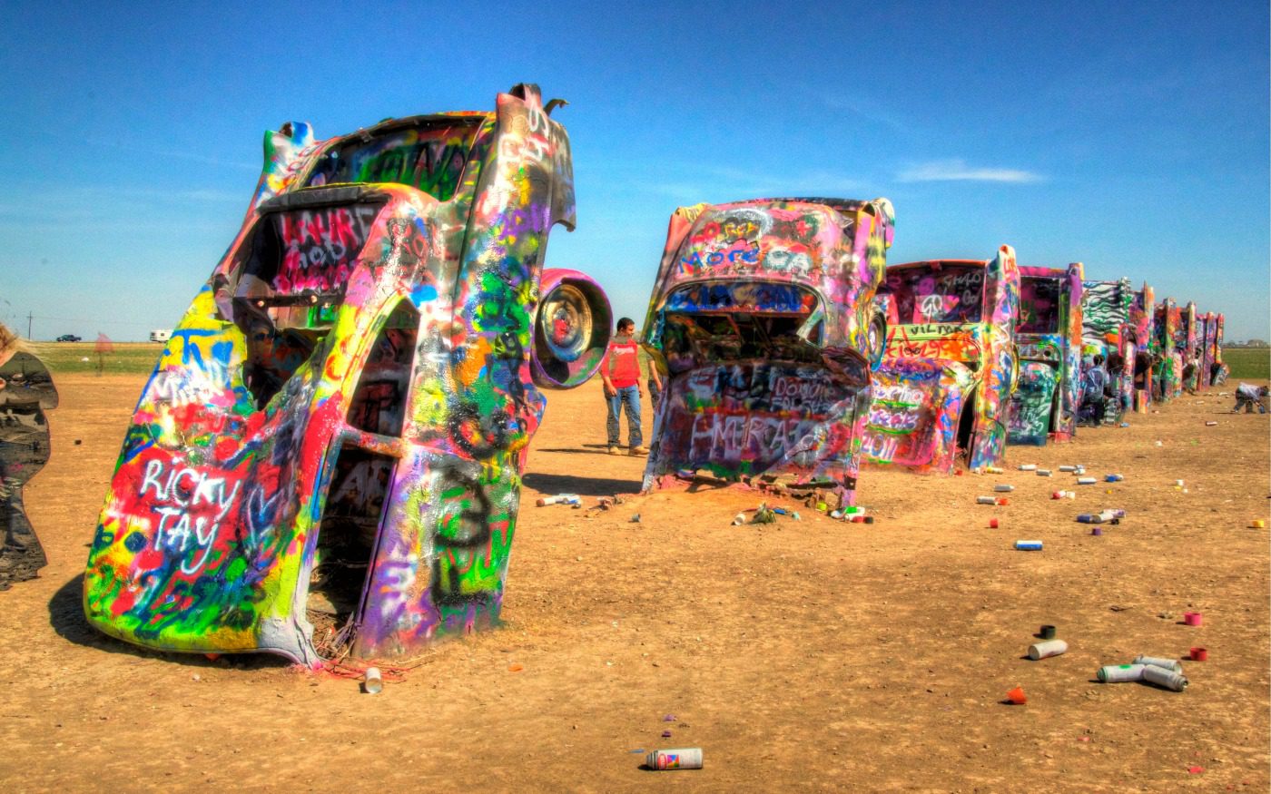 A Texas roadside art installation featuring half‑buried Cadillacs.