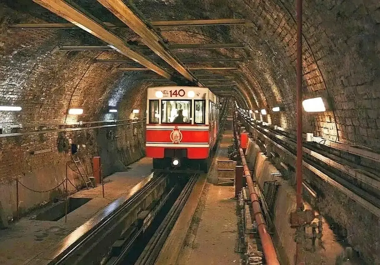 Part of the underground funicular “Tünel” on the northern shore of the Golden Horn in Istanbul. The line connects two stations — the lower “Karaköy” (1.15 m above sea level, Arap-Cami district, Beyoğlu municipality) and the upper “Beyoğlu” (62.7 m above sea level, Saşkulu district, Beyoğlu municipality).