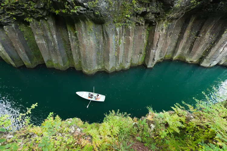 The basalt columns at Takachiho Gorge were formed some 270,000 years ago as a result of four eruptions of the Mount Aso volcano. Since, the Gokase River has cut through the columns, creating a narrow, V‑shaped chasm through which beautiful blue-green water flows. Boats float down the four-mile gorge in the shadow of these 300-foot, red-tinted cliffs. The site has been protected as a National Scenic Spot and Natural Monument in Japan since 1934.