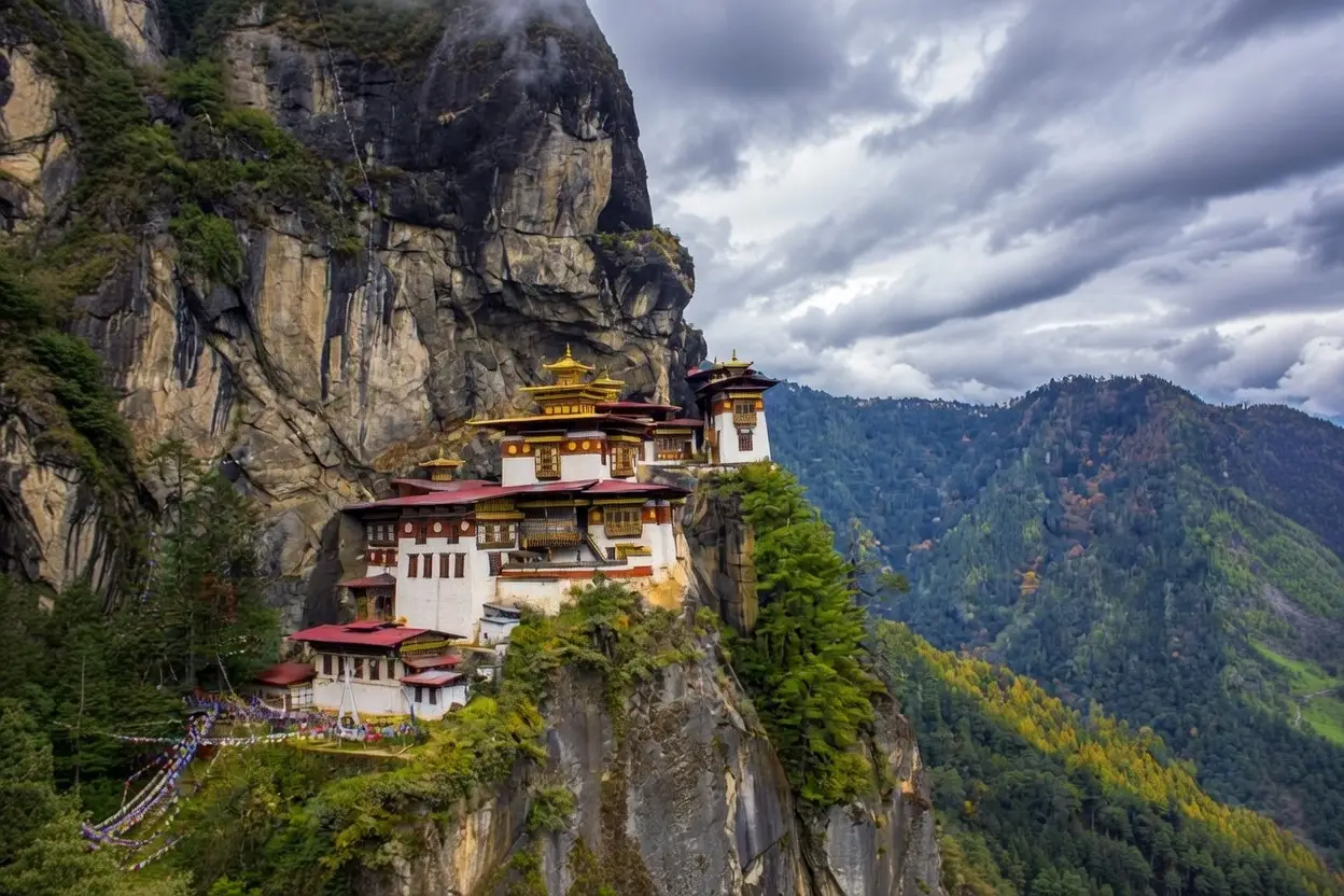 The Taktsang Palphug Monastery, also known as Paro Taktsang and the Tiger’s Nest, is precipitously tucked away in the mountains. It is perched on a cliff at an elevation of over 10,000 feet, overlooking the Paro valley in Bhutan, the small Himalayan country nestled between India and China. With white buildings and red and gold roofs, the monastery is an exquisite jewel hidden among the rugged beauty of its surroundings. The individual buildings that comprise it are connected by stairways carved into the rock, and numerous balconies provide a breathtaking view of the valley below. The monastery was built in 1694 at the cave where, according to legend, Buddhist guru Padmasambhava meditated for three years, three months, three weeks, and three hours back in the eighth century. The name “Tiger’s Nest” comes from the story that Padmasambhava flew to the cave on the back of a tiger.
