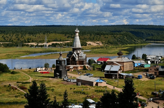 Старинное поселение с храмами и деревянной застройкой.