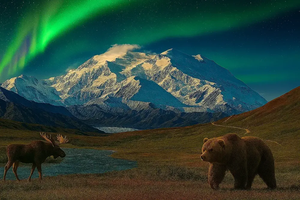 Парк Денали, бухта Глейшер, ледники и северное сияние создают условия для походов, круизов и наблюдения за китами, где обитают гризли, белые медведи и горбатые киты, а кухня включает лосося, камчатского краба, оленину и чили из оленины.