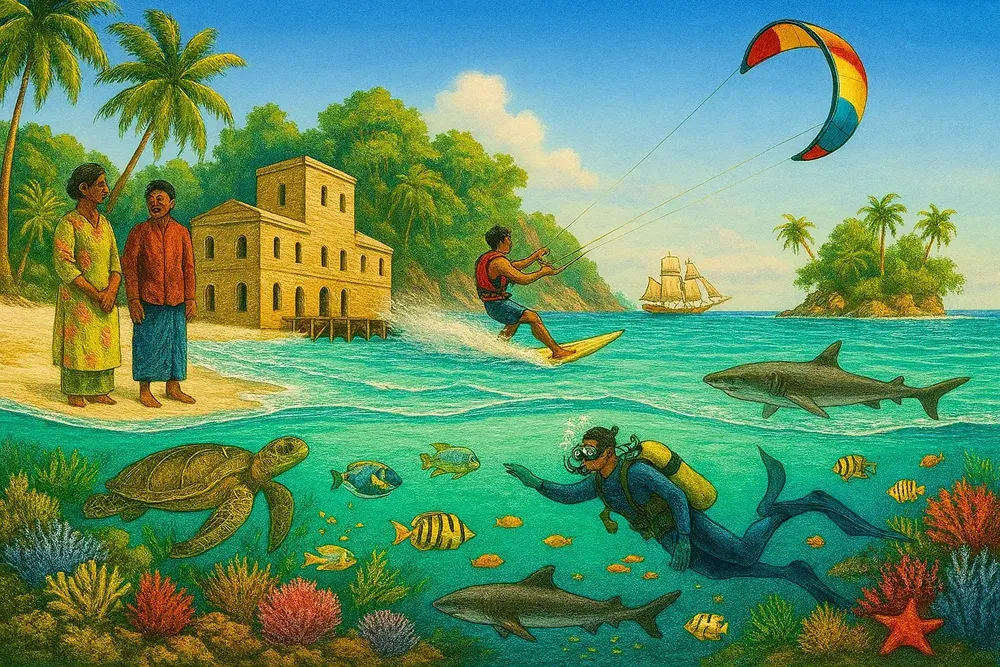 Бирюзовые лагуны, белые пляжи и нетронутые коралловые рифы, дайвинг и кайтсёрфинг, малайцы Кокосовых островов с уникальной культурой и языком, черепахи, дельфины и рифовые акулы.