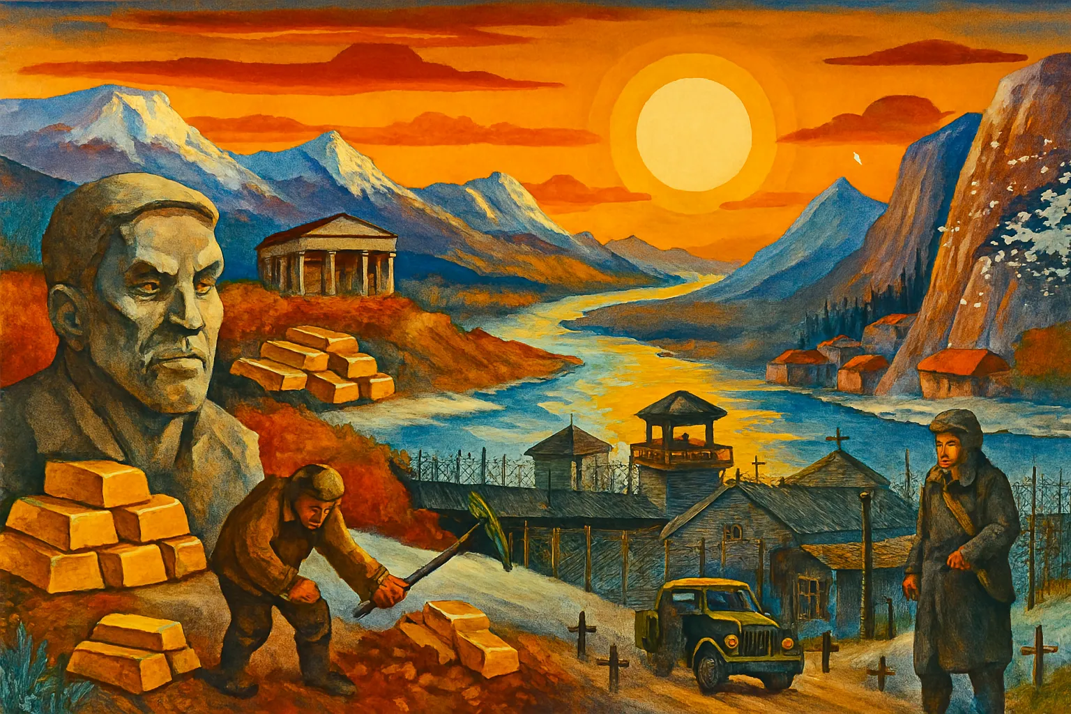 Лагерь ГУЛАГа в Магаданской области, символ репрессий и каторжного труда.