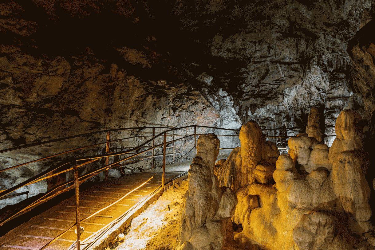 Карстовая пещера с залами, сталактитами и подземными реками.