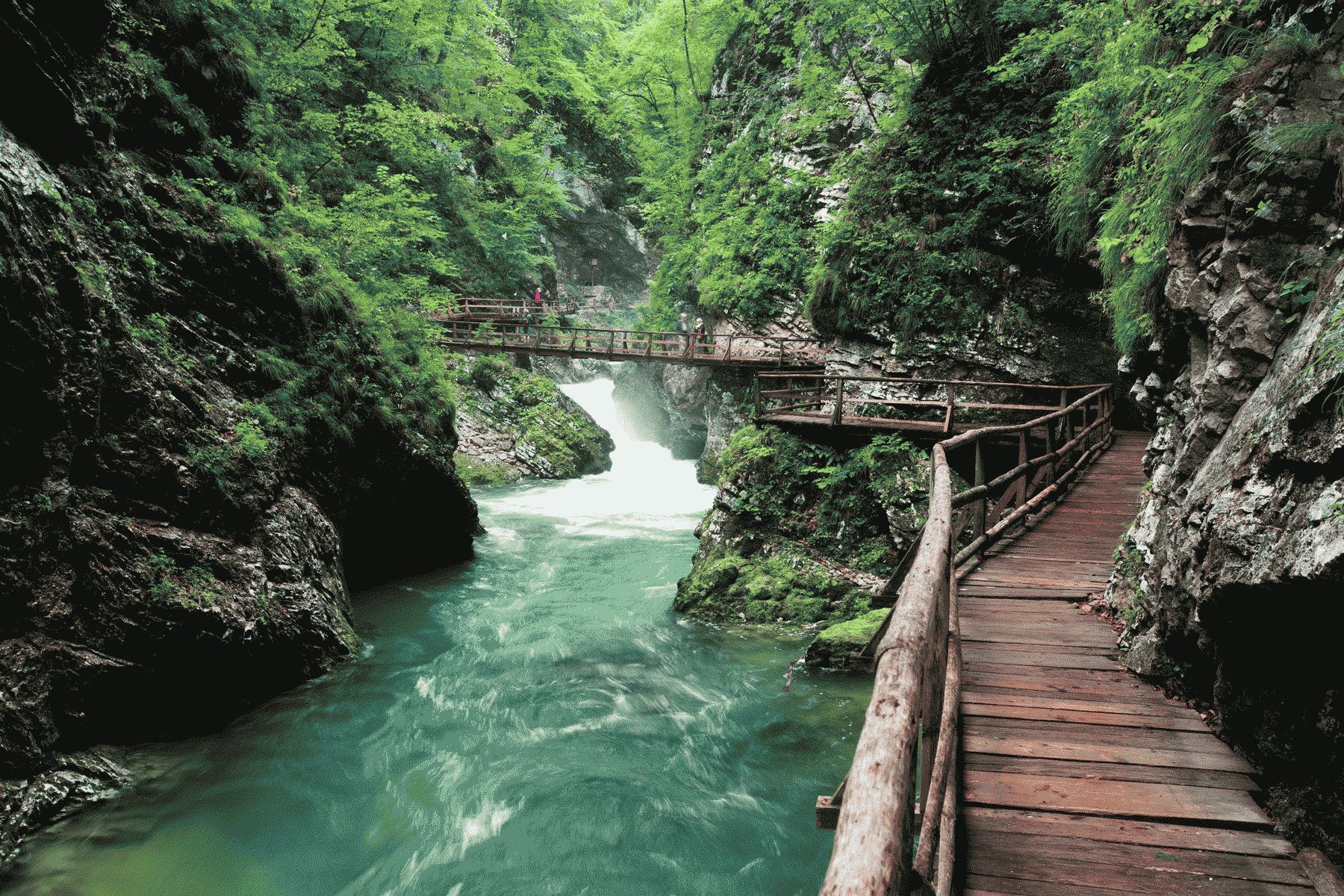 A narrow and very picturesque gorge, the walls of which rise vertically above the Radovna River by 50–100 m. At the northern end of the gorge is the Shum waterfall, over which there is a pedestrian bridge. You can walk through the gorge along wooden walkways hanging on its walls, which sometimes descend to the water level. There are parking lots on both sides of the gorge, and if you are traveling without a car, you can walk right through the gorge. It is convenient to get there by train, passing through the Bled Lake station: it makes the stops Vintgar and Podhom, from each of which 1.5 km to the entrance to the gorge. As part of the Triglav National Park, the gorge is an official tourist site with seasonally varying opening hours and entrance fees. The gorge is closed in winter; some travelers have been able to get inside for free, although this may be hampered by scheduled maintenance work on the footpath. In summer, on the contrary, the gorge can be a bit crowded.