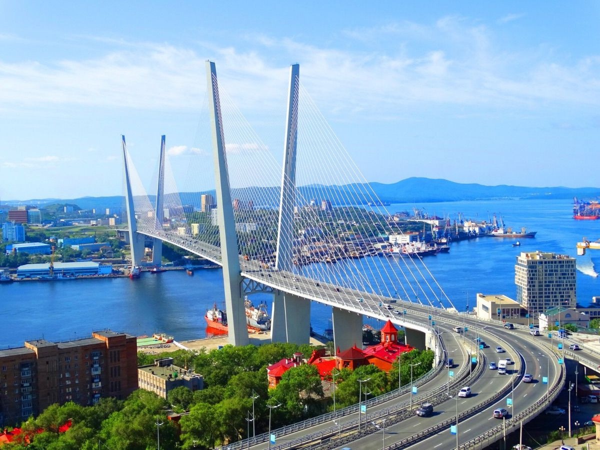 The bridge over the Zolotoy Rog Bay in Vladivostok was built from Russian steel, assembled into blocks at the Nakhodka shipyard. The cable stays for the structure were manufactured by the French company Freyssinet International and Company. The length of the bridge is 1388.09 m. The length of the bridge crossing along the main section is 2.1 km.