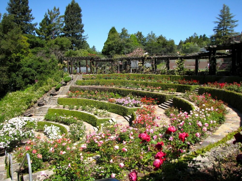A terraced California garden with thousands of roses and sweeping views of San Francisco Bay.