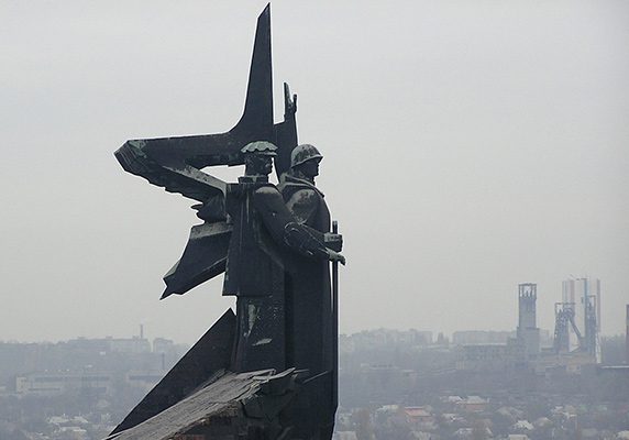 To Donbass Liberators is located in Lenin Comsomol Park, Donetsk, dedicated to all the military units and formations that liberated Donbas during World War II. The monument itself is in the shape of a triangle that is a group of three inclined walls coming out of the ground to symbolize the silhouettes of Donetsk terricones by their sharp edges. An “eternal flame” is located at the foot of the monument.