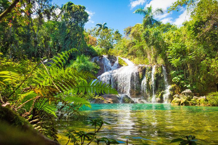 Driving here along the twisty rutted roads is an adventure in itself, and the scenery is beautiful. Once you arrive and pay the entrance fee, take the 1.5‑mile palm-lined trail to the park’s most scenic spots. It meanders along a cool river and ascends through thick, tropical forest to the falls, where you can swim and sunbathe. Along the way, keep an eye out for the tocororo, Cuba’s national bird, and the beautiful royal palm.