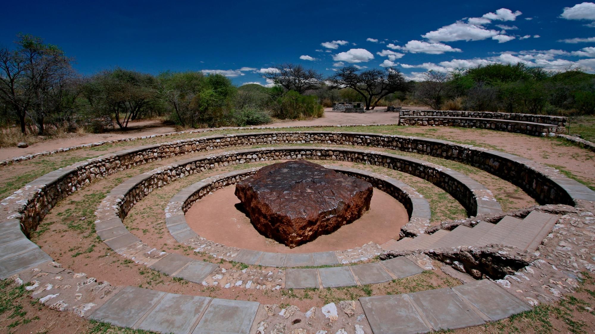 No one knows for sure how the meteorite got to this location; it may have bounced across the Earth from the original impact site to its current location. The large cube-shaped form (about 3 by 3 metres in circumference and 1 metre high) was discovered in 1920 by farm owner Jacobus Hermanus Brits when his plow struck it. The American Museum of Natural History in New York tried to buy the meteorite in 1954 but was unable to transport it, and the site was declared a national monument in 1955, although it was not open to visitors until 1985. The area has now been landscaped with a pleasant herbaceous garden and picnic area, as well as easy access to the meteorite. It is a pleasant place to stand and contemplate the stone’s extraterrestrial origins, not to mention its incredible age: the meteorite is estimated to be between 200 and 400 million years old.