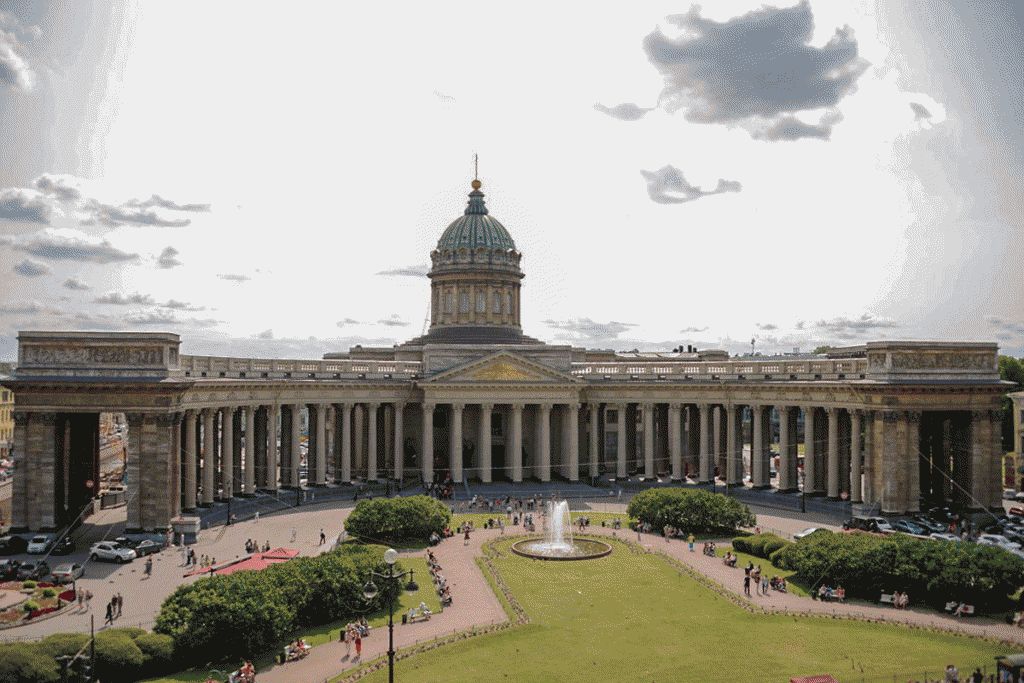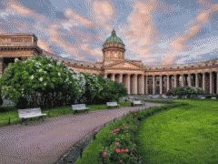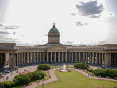 One of the largest churches in St. Petersburg, built on Nevsky Prospect in 1801–1811 by the architect A. N. Voronikhin to store the revered copy of the miraculous icon of the Mother of God of Kazan. Made in Empire style. After the Patriotic War of 1812, it acquired significance as a monument to Russian military glory. In 1813, commander M.I. Kutuzov was buried here and the keys to the captured cities and other military trophies were placed.