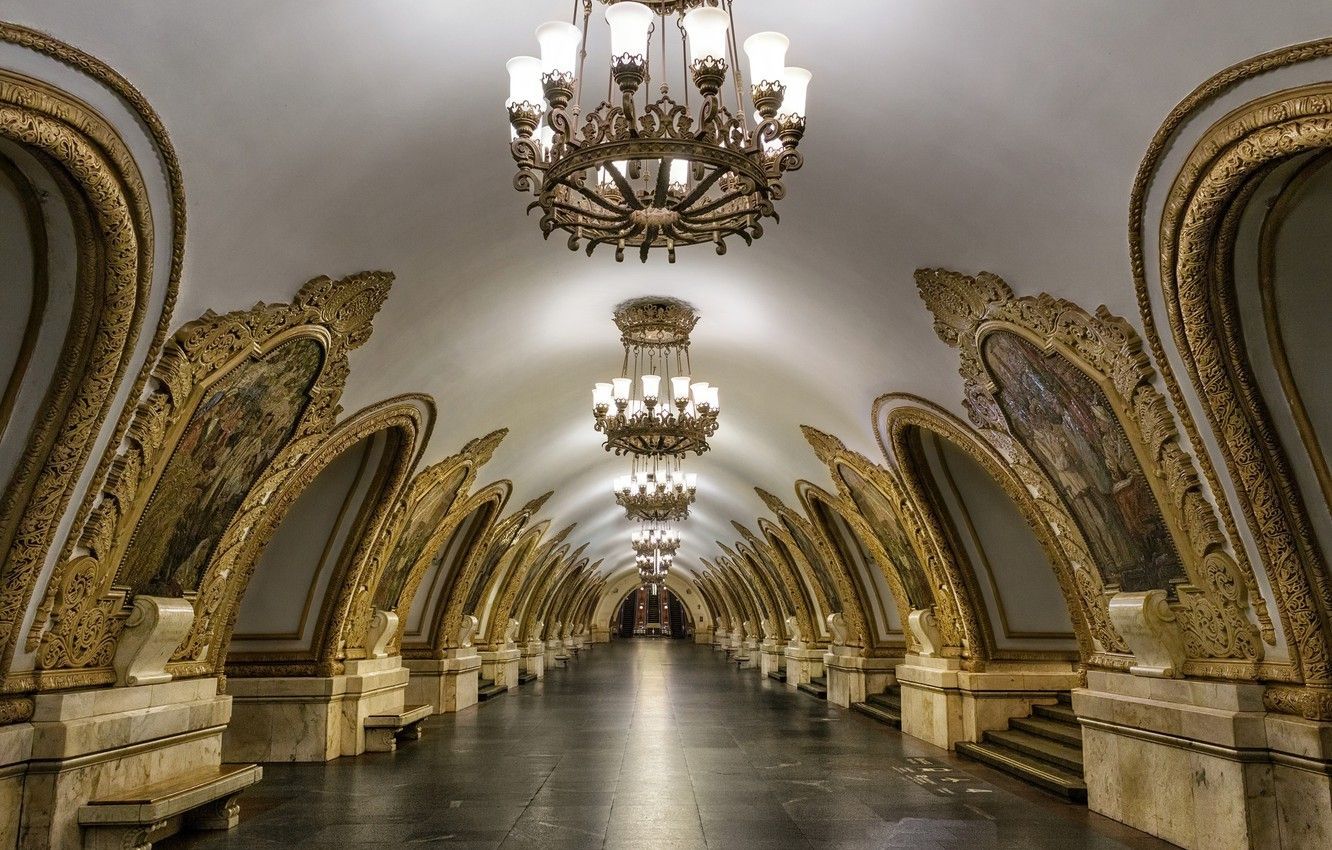Станция метро с мозаиками и световыми композициями, превращающими подземное пространство в художественный зал.