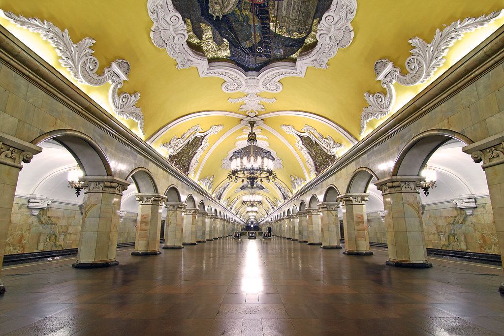 Станция метро с мозаиками и сталинским ампиром, одна из самых парадных в Москве.