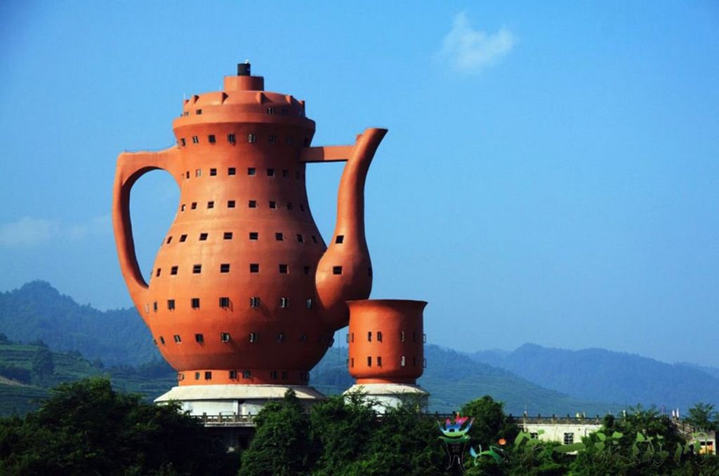 A 73.8‑meter high teapot-shaped building, located in Meitan, is the world’s biggest teapot-shaped building. It is the proud symbol of the “hometown of Chinese Green Tea” with a floor area of over 5000 square meters and a maximum diameter of 24 meters.
