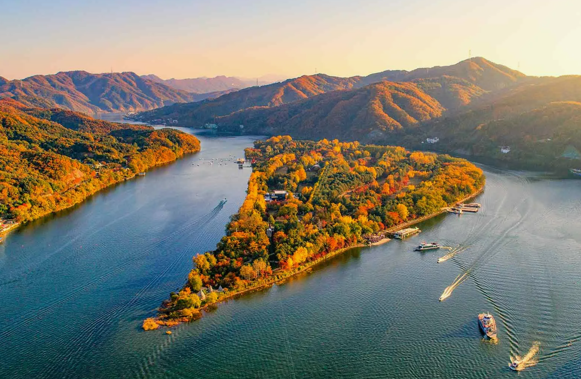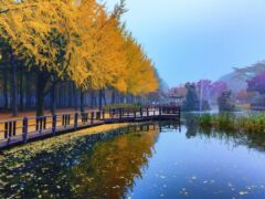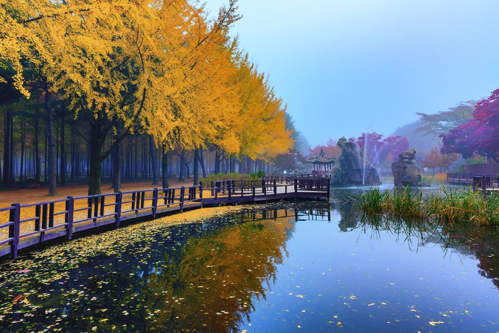 A crescent-shaped island that appeared as a result of the construction of the Cheongpyeong Dam. Popular for its picturesque alley. The peculiarity of the island is that there are no cars, only electric cars, all the electric wires are laid underground so as not to interfere with admiring nature. An interesting eco-hotel, silence and at night you can hear the frogs croaking. Many unusual sculptures, museums, exhibitions, various events. The beauty of its surroundings has allowed it to become one of the best tourist destinations for a one-day trip near Seoul. Nami Island with beautiful tree alleys, forests, walks along the river bank and fun entertainment offers a romantic landscape all year round.