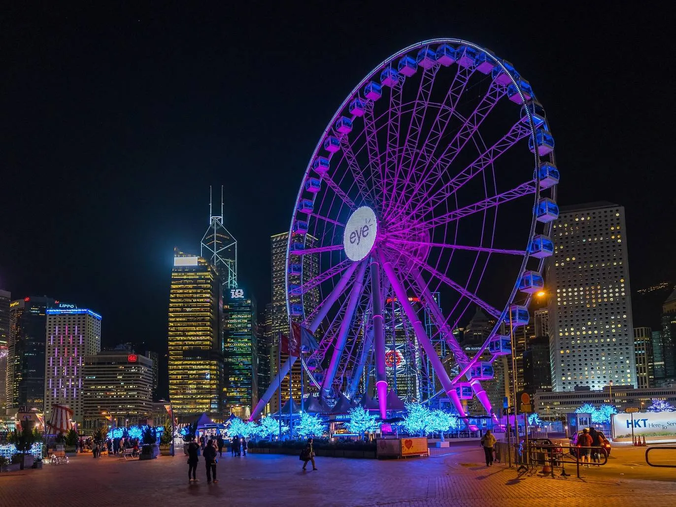 Views of Victoria Harbour and Central. The whole circuit on this 60-metre-high Ferris Wheel takes around 15 minutes, providing ample opportunity to get your snaps of the city, whether during the day or at night.