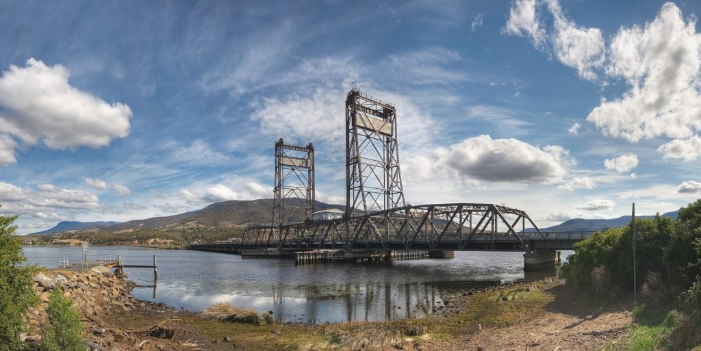 Разводной автомобильный и железнодорожный мост через реку Дервент. Строительство первого моста на этом месте, также названного «Бриджуотер», было разрешено лейтенант-губернатором Ван-Дименовой Земли (ныне Тасмания) Джорджем Артуром.