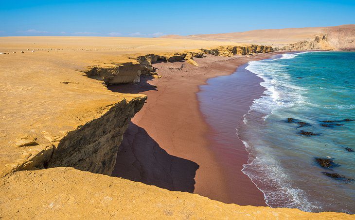 Aptly named because of its rust-colored sands, Playa Roja (Red Beach) sits at the heart of the Paracas National Reserve. The red sands are particularly stunning as they sit between the ocean and the yellow cliffs. Most of the reserve consists of tropical desert with intense winds, making for dramatic, contrasting views against the foamy blue waters.