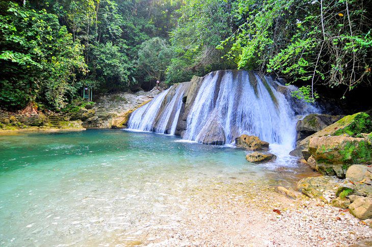 You can stand under the streaming cascades, explore underwater caves, and swim in the fern-fringed waters surrounded by rainforest — more than 20 different species of ferns grow in this emerald forest. Keep an eye out, too, for some of the many species of birds here, including yellow-billed parrots. It’s also a good idea to bring water shoes.