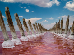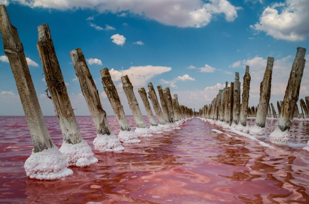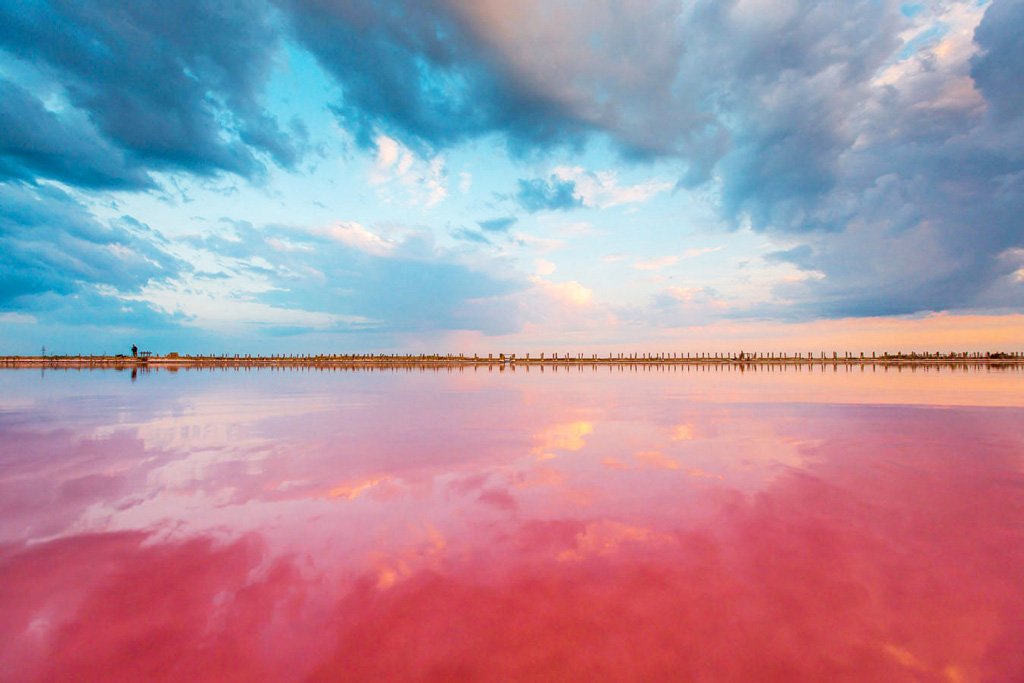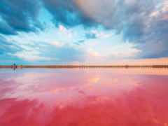 The lake’s water turns pink thanks to the unique algae Dunaliella salina, which releases carotenoids at high salt concentrations.
