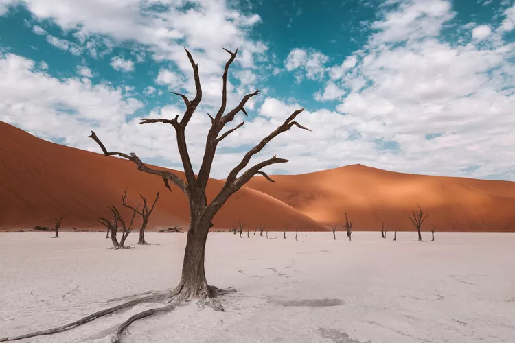 The star attraction of Namibia’s Namib-Naukluft National Park is this claypan surrounded by soaring, ever-changing red-orange dunes that stop the flow of the Tsauchab River. In the native language, Sossusvlei means “dead-end marsh.” The dunes that circumnavigate the pale flat, dotted with leafless vegetation, are some of the loftiest and oldest in the world. Many are well over 650 feet tall and thought to be 5 million years old. While the dunes vary in color, the ones displaying the brightest shades of red—indicating a high concentration of iron—are the oldest.