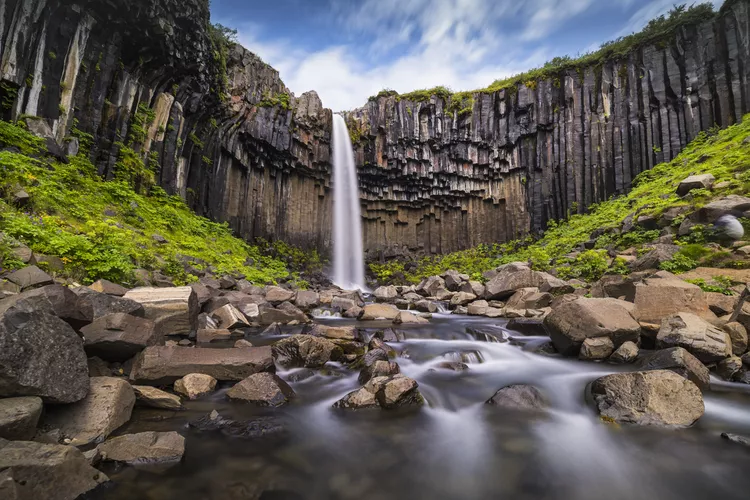 Another basalt-column cliff decorated by falling water, Svartifoss in southern Iceland’s Vatnajökull National Park is called “black waterfall” in Icelandic due to the dark color of the volcanic rock. The basalt formation, surrounded by Iceland’s signature lush greenery, has inspired such architectural works as the National Theatre in Reykjavik and was featured in Bon Iver’s music video for the song “Holocene.” It can be reached via a short hiking track, but visitors are warned against swimming as some of the basalt has cracked off from the cliff and created quite a sharp surface under the water.