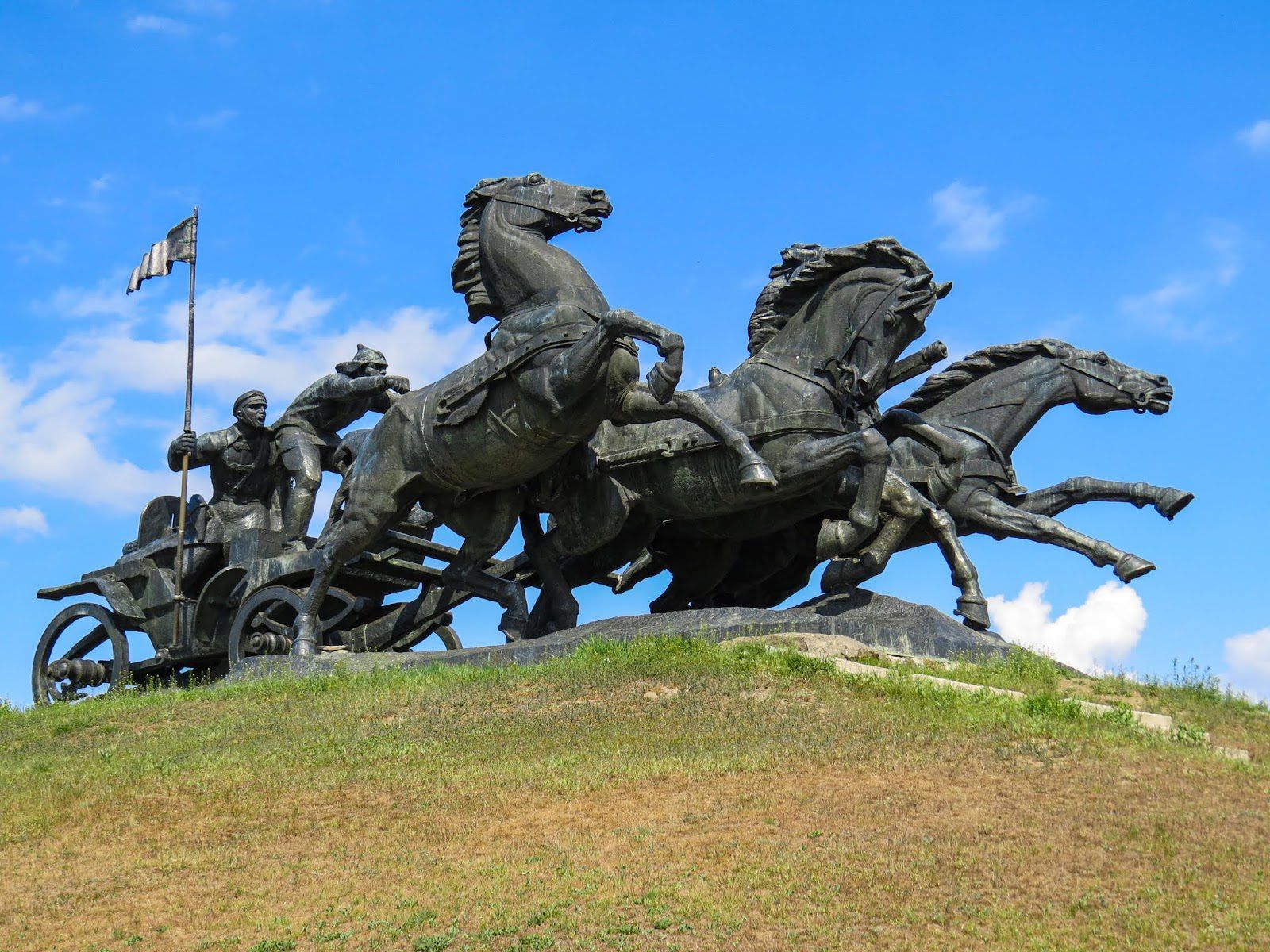 A grandiose monument dedicated to the Civil War in USSR. The bronze sculpture depicts an authentic cart-mounted Maxim gun drawn by a horse, flanked by two Red Army soldiers in greatcoats. The monument stands on a granite pedestal, decorated with reliefs illustrating the 1918–1920 battles. The monument stands on a large mound. The earth for this mound was brought from the sites of Civil War battles from all over the Soviet Union.