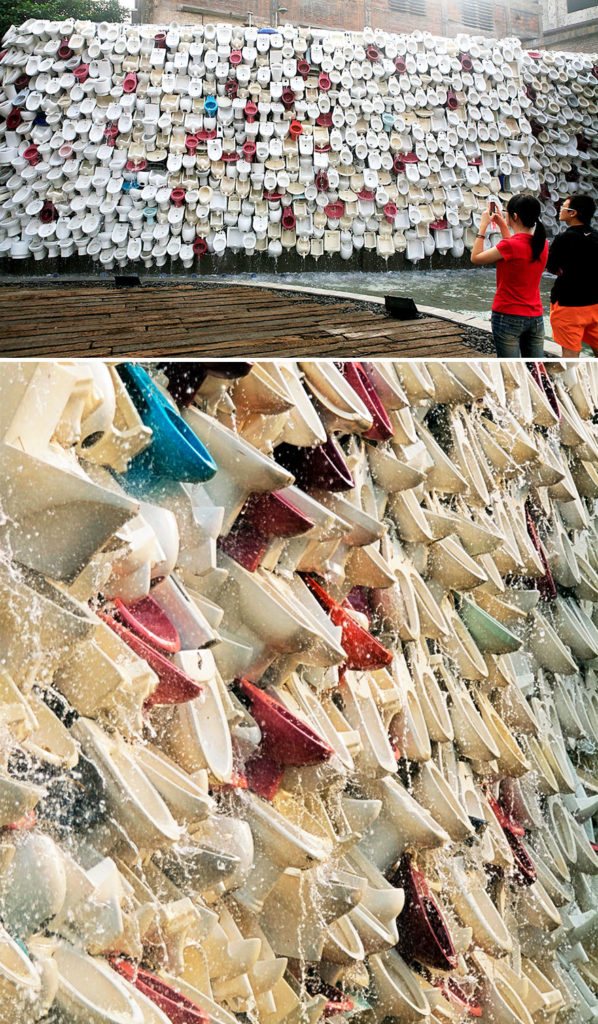 The “art piece” was created by Chinese artist Shu Yong, who along with his team, spent 2 months installing the toilets. The toilets are a mixture of unwanted factory seconds and ones donated by foreigners and locals. All the toilets and urinals are actually connected to a tap so that they could be flushed. The installation is flooded periodically, creating a cascading waterfall to the amusement of the onlookers.