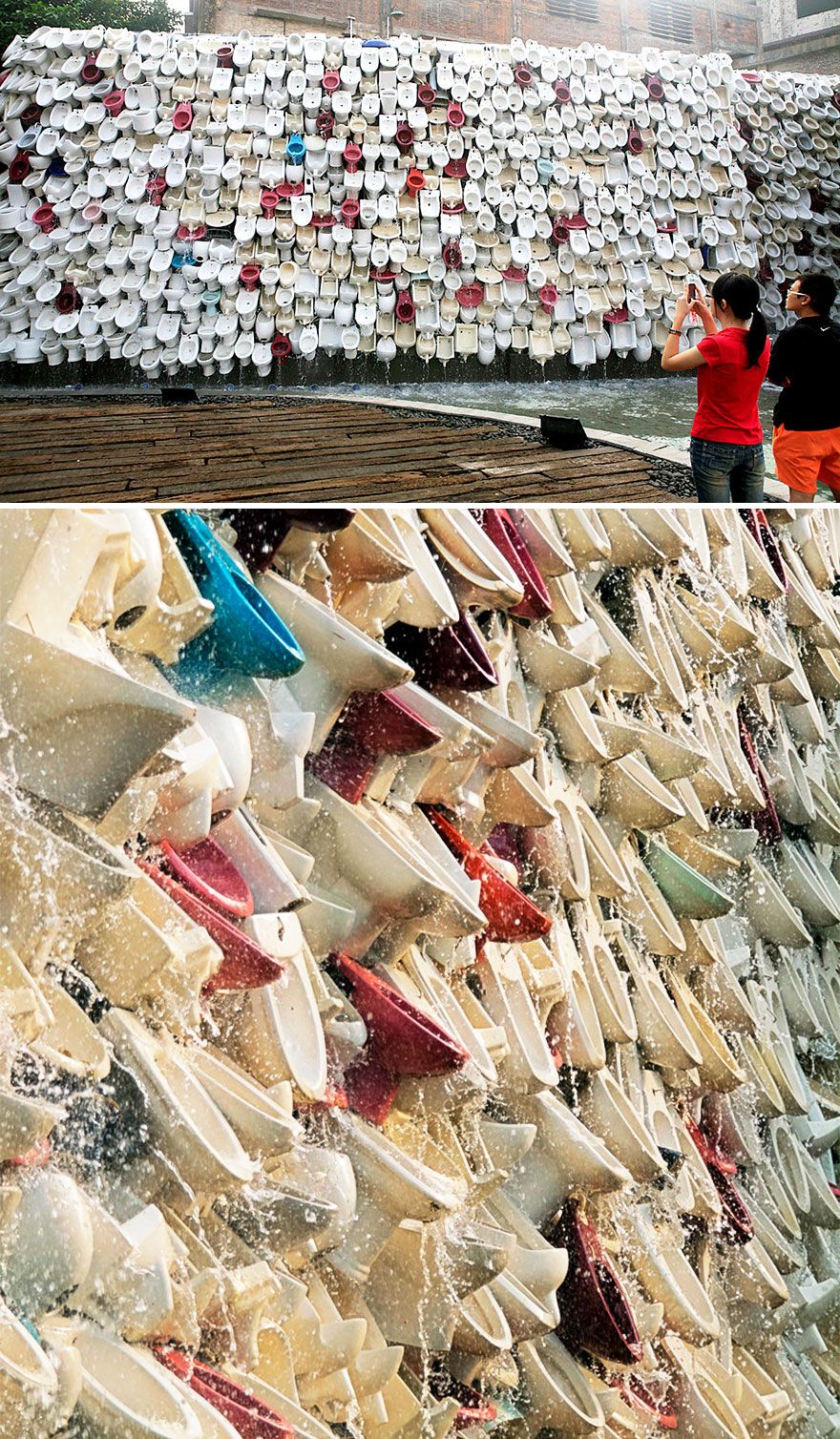 Foshan, a city in central Guangdong province in China, has one of the strangest pieces of public art — a fountain built out of 10,000 recycled toilets, sinks and urinals covering a wall 100 meters long and almost 5 meters high. The fountain/waterfall was originally designed for the 2009 Foshan Pottery and Porcelain Festival, a porcelain product tradeshow, before being installed as a permanent piece of public art. It is just one of the many impressive ceramic sculptures residing in Shiwan Park.