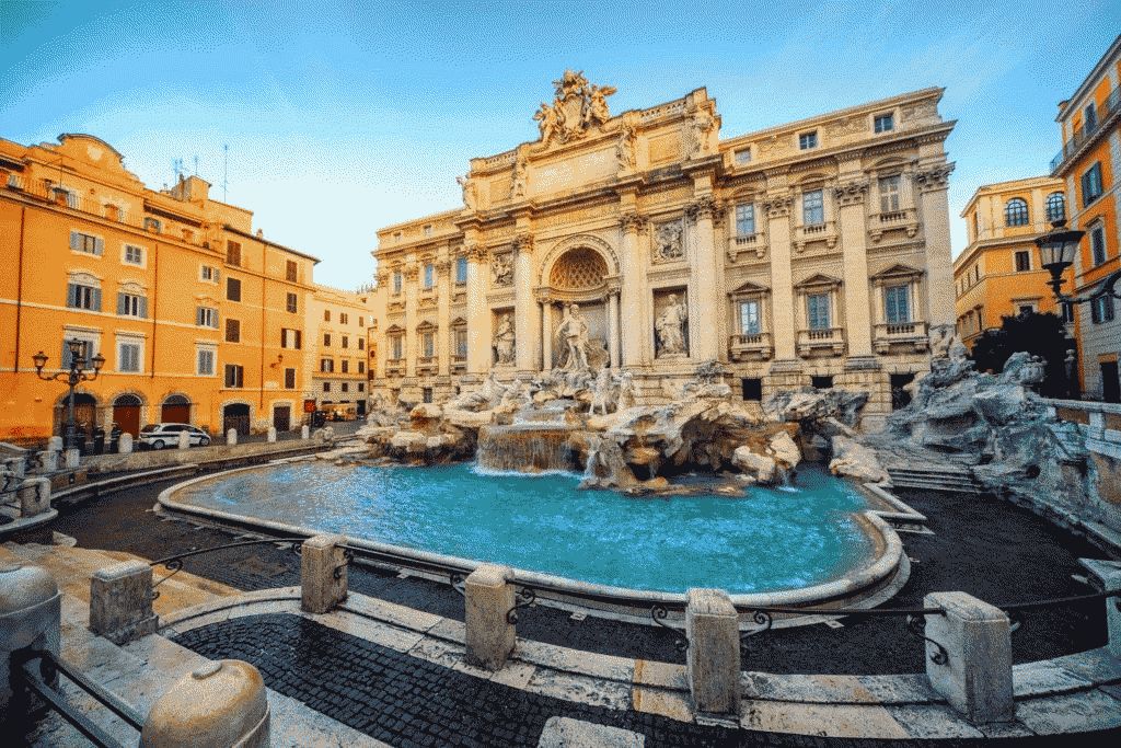The Trevi Fountain is without any doubt the most famous of all the famous fountains in Rome. It is located in the district of the same name and on the square named after it, north of the historical center of the Italian capital. This amazing example of Rococo architecture in Rome was built between 1732 and 1762. It is still fed by one of the city’s oldest aqueducts and is of monumental proportions. Its length is 49 meters and its height reaches 26.3 meters.