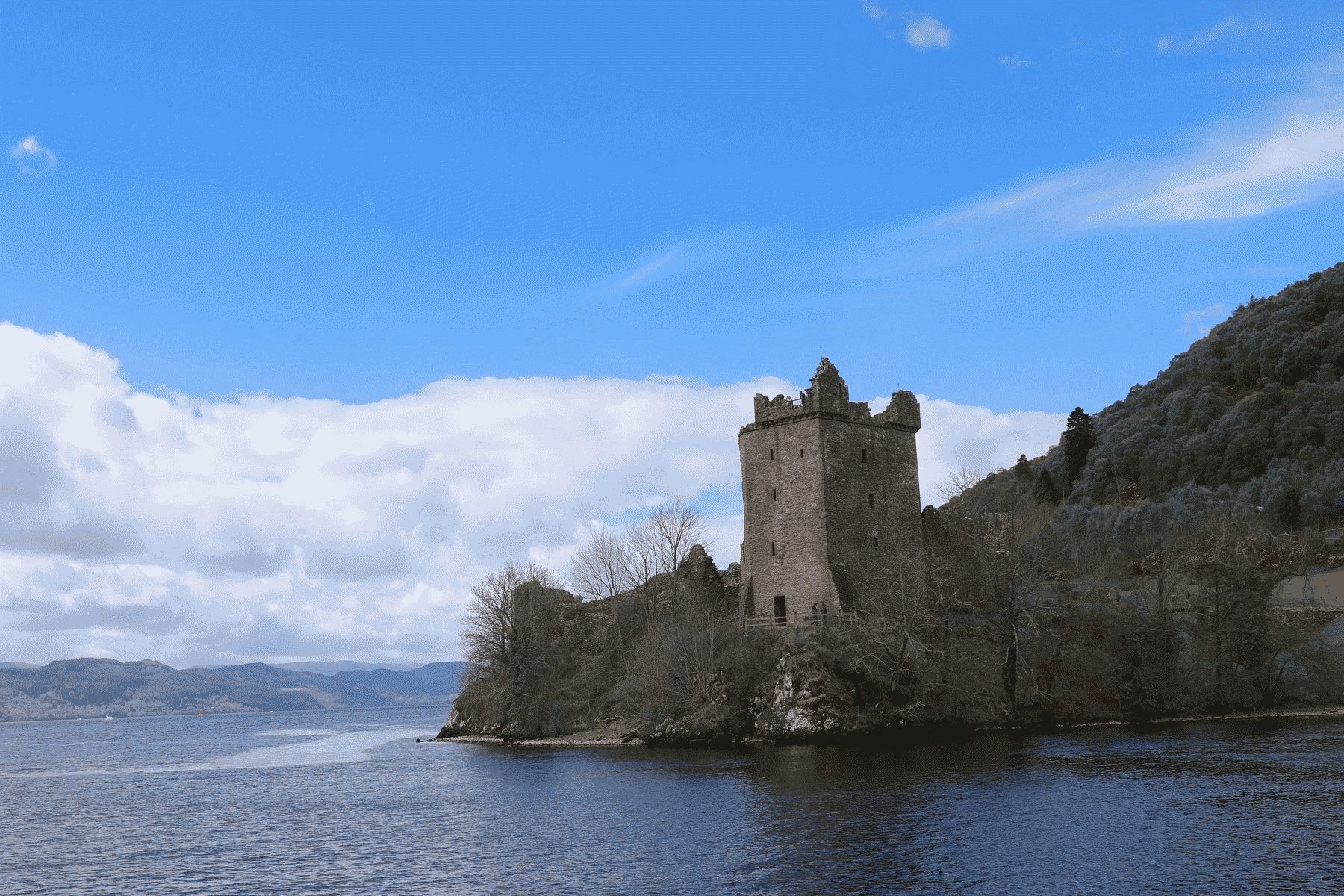 Impressive 13th- to the 16th-century ruins on a headland overlooking Loch Ness. The most famous site in the area. The castle is in ruins but an impressive ruin with walls, four turrets and the keep. The beauty of the place coupled with its history makes it so attractive. The position of the castle at Strone Point is dramatic and commands a wide view of Loch Ness. There had been a fortress at that point from ancient times and the castle was associated with big names of Scottish history such as Saint Columba (6th century) and Robert the Bruce (12–13th century). The end came with a bang in the final years of the 17th century when it was packed with explosives and blown up to render it useless to the Jacobites. Those visiting the castle must not miss the dramatic audiovisual presentation at the centre there, certainly one of the best anywhere in the world. It is in English but depending on the composition of the tourists sub-titles are added in some other languages.