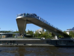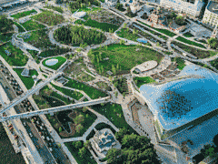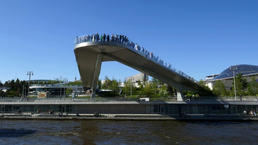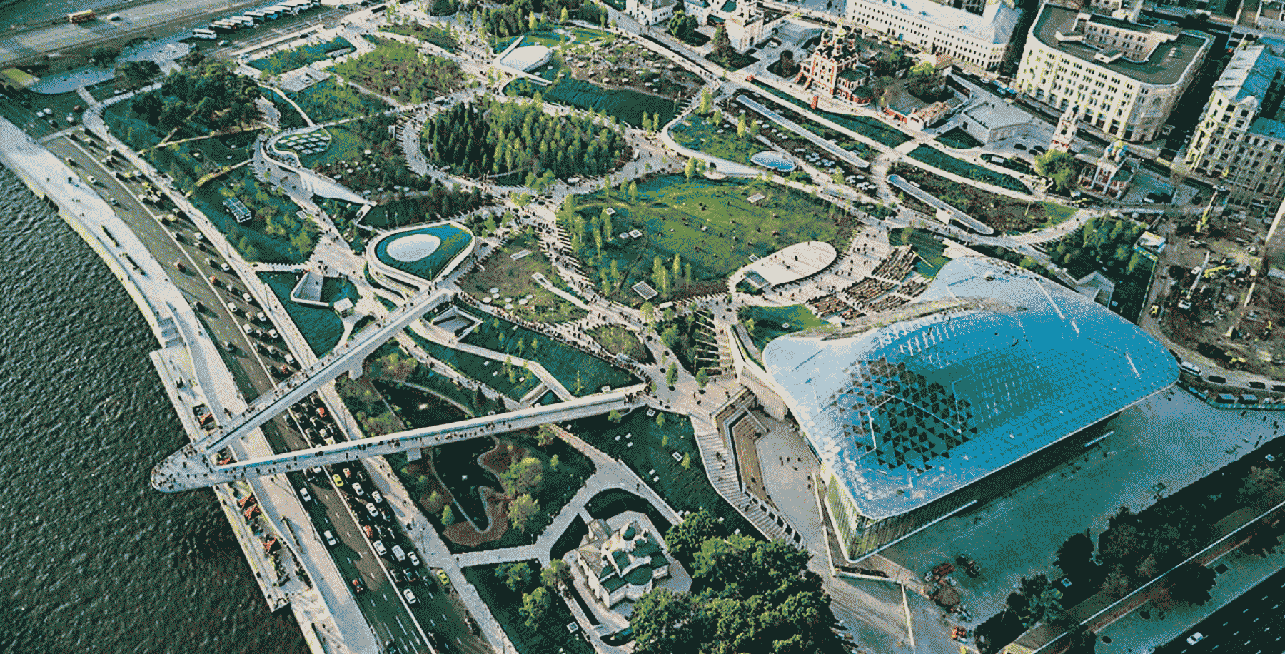 Современный парк с амфитеатром и стеклянным куполом, символ обновлённой Москвы.